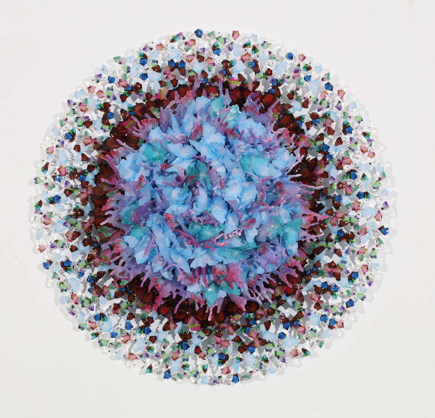 Annalù’s art often manifests as “dreamcatchers,” mandala-like structures, spirals, and imaginary architectures that suggest metamorphosis and passage through time. Her use of resin and glass—especially Murano glass—brings a luminous fragility to her work, marrying classical craft with contemporary experimentation and creating sculptural narratives that resonate with both intimacy and symbolic depth.